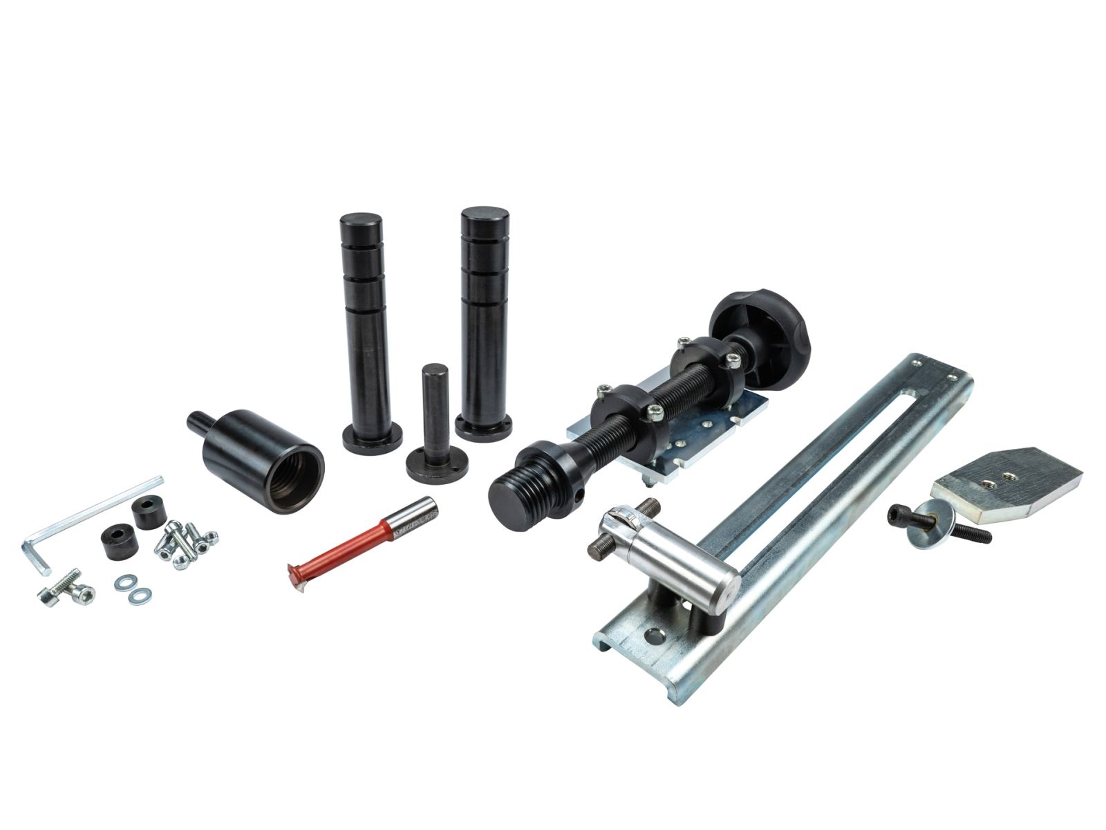 Bei Anschlussgewinde M33 x 3,5 kann das Spannfutter, in dem das Werkstück aufgespannt ist, direkt montiert werden. Mit dem gelieferten Fräser (Schaft 14 mm) und Zubehör fertigt man metrische Spitzgewinde mit Steigung 2,5 mm (optional 3,5 mm) bis zu 50 mm Länge in Holz.