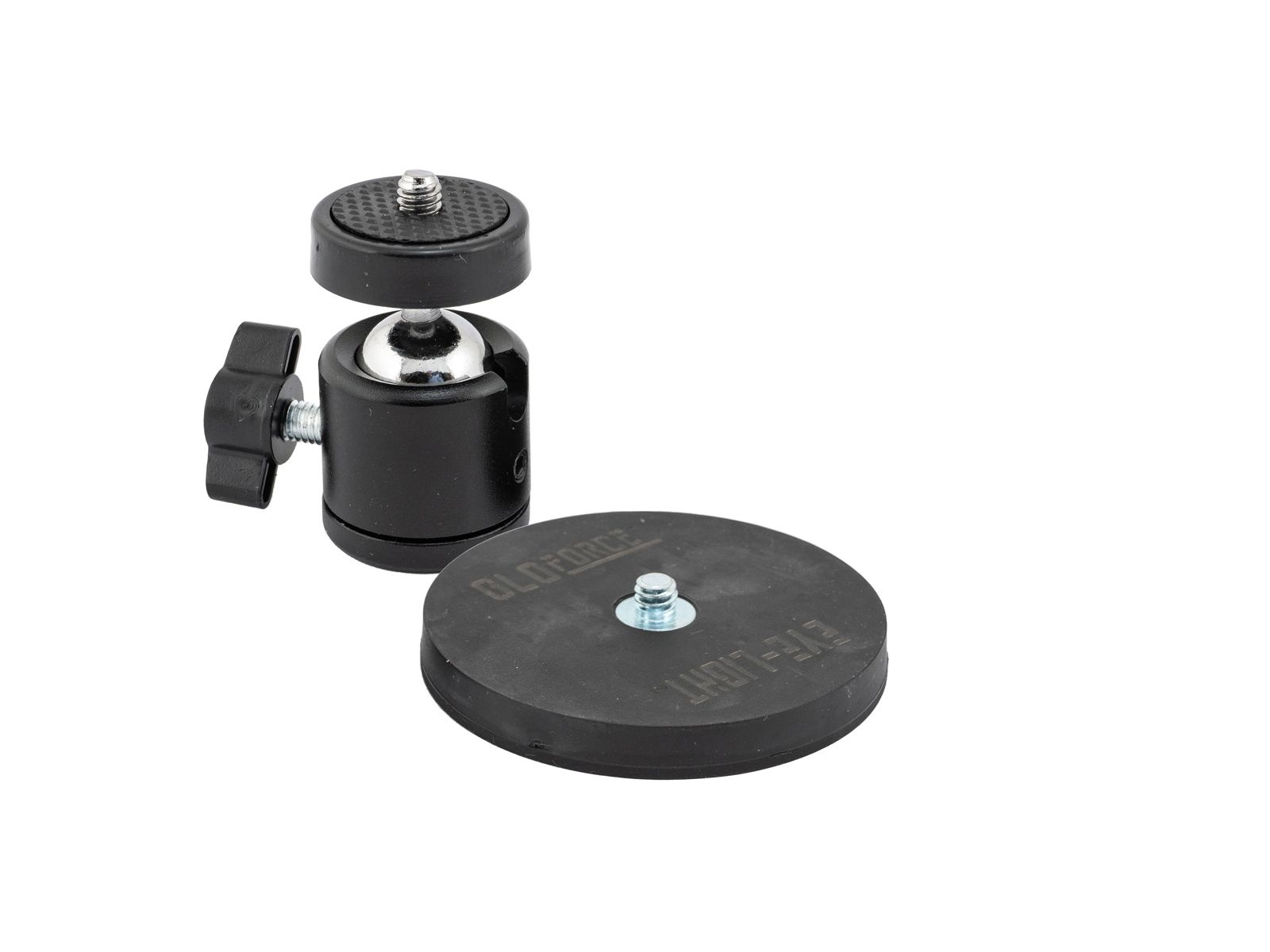 Die gummierte Basis-Grundplatte verfügt über einen starken Magneten und sorgt für sicheren Halt. Das Kugelgelenk mit 90° Öffnung wird per Gewinde an der Basis-Grundplatte befestigt. Das Gewinde der Grundplatte sowie das Gewinde des Kugelgelenks ist als 1/4" UNC Gewinde ausgeführt und somit mit anderen EYE-LIGHT Produkten kombinierbar.