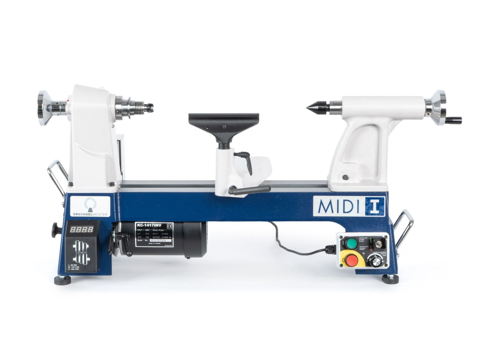 Die MIDI 1 ist die überarbeitete Version des Tischdrechselbank-Klassikers MIDITEC FU-175, welche sich in unzähligen Drechselwerkstätten bestens bewährt hat. Die neue Version behält die soliden Eigenschaften des Vorgängers bei und ergänzt diese mit modernen Sicherheitseinrichtungen. So verfügt die MIDI 1 nun über einen beleuchteten LED-Starttaster (leuchtet bei Maschinenbetrieb) und einer neuen Spindel mit M33 x 3,5 mm Gewinde und ASR-(Euro-)Ablaufsicherungsnut. Eine gelbe LED-Warnlampe leuchtet bei aktiviertem Rückwärtslauf. Der Reitstock ist nun massiv ausgeführt und mit einer Trapezgewindespindel ausgestattet. Die Pinole mit einem Pinolenweg von 100 mm (!) eignet sich jetzt auch optimal zum Bohren von Werkstücken. Das Handrad am Reitstock ist mit einer gelagerten Kurbel ausgestattet.
