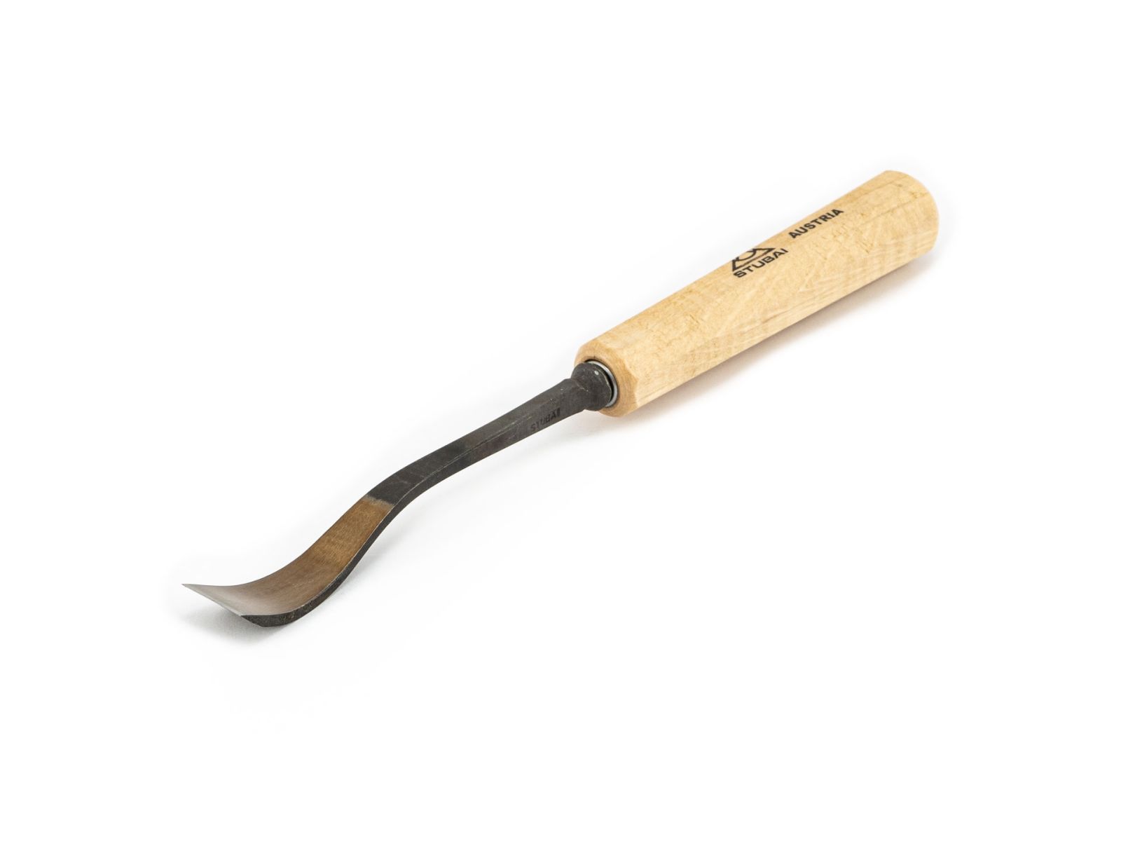 Das gekröpfte Balleisen mit gerader Schneide vom STICH 1 wird für glatte Flächen, zum Vorstechen und für Kerb- und Reliefschnitzarbeiten genützt.